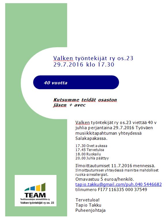 Valken työntekijät ry os.23 viettää 40 v juhlia perjantaina 29.7.2016 Työväen musiikkitapahtuman yhteydessä Salakapakassa.